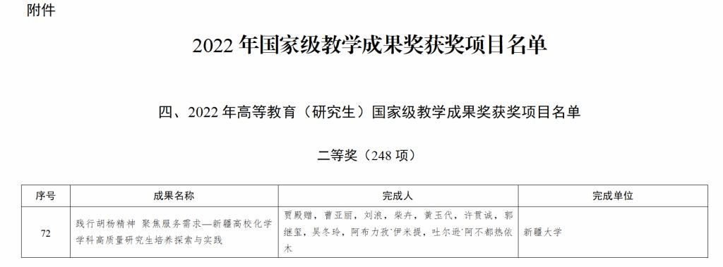 近日,中华人民共和国教育部发布《教育部关于批准2022年国家级教学成果奖获奖项目的决定》的通知,我院贾殿赠教授团队申报的教学成果“践行胡杨精神 聚焦服务需求—新疆高校化学学科高质量研究生培养探索与实践”获2022年高等教育(研究生)国家级教学成果奖二等奖。