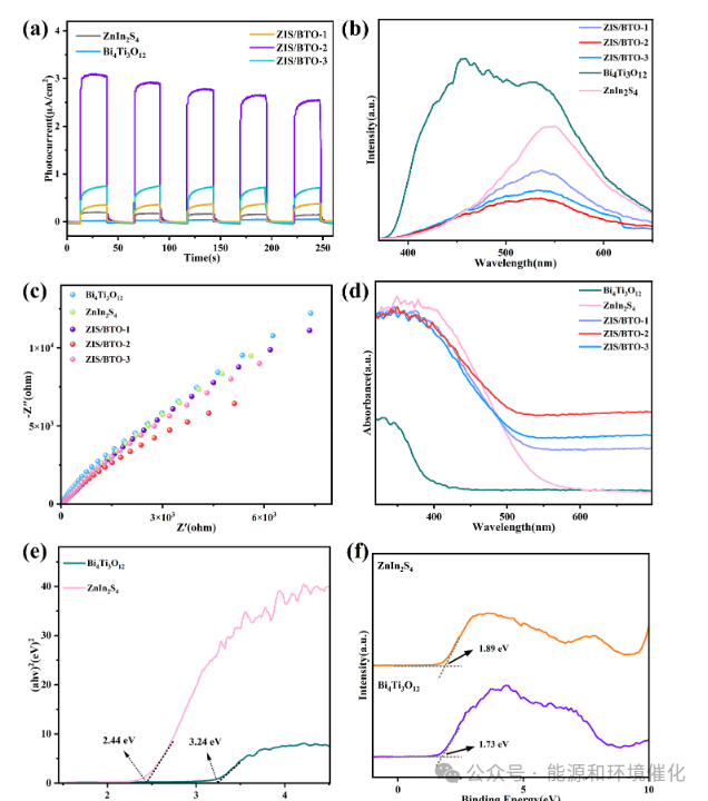 UV-Vis 漫反射光谱(Fig.5d)显示,纯 BTO 的吸收边约为 398nm,仅响应紫外光;而 ZIS/BTO 复合材料的吸收边发生明显红移,延伸至可见光区域,且吸收强度增强。这一变化扩大了催化剂对太阳光的利用范围,提升了可见光利用率,为可见光下催化活性的提升提供了光学基础。