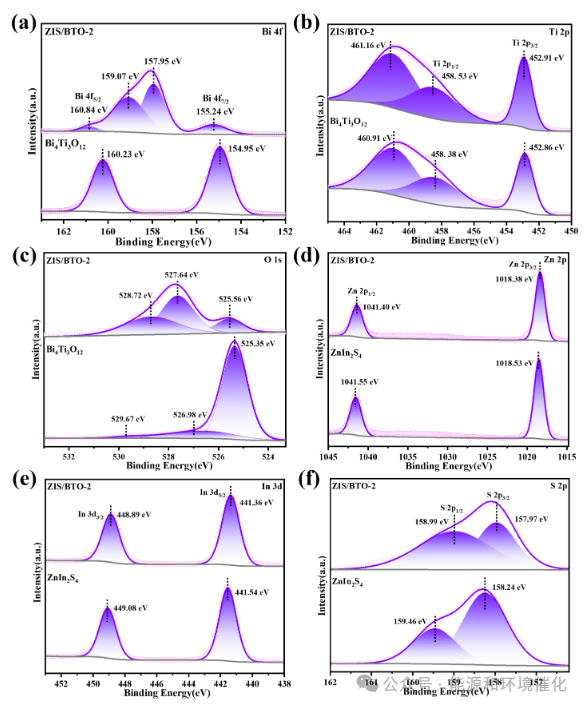 XPS 全谱证实 ZIS/BTO-2 中存在 Bi、Ti、O、Zn、In、S 六种元素(图 S3)。高分辨 XPS 图谱中,BTO 的 Bi 4f 特征峰位于 160.23eV(4f₅/₂)和 154.95eV(4f₇/₂),而 ZIS/BTO-2 中 Bi 4f 峰出现正向偏移,Ti 2p 峰也向高结合能方向移动,In 3d 峰则向低结合能方向偏移(图 4a-e)。这些结合能的变化表明 ZIS 与 BTO 界面存在电荷转移,BTO 表面失去电子,ZIS 表面获得电子,为异质结内建电场的形成和载流子分离提供了直接证据。S 2p 图谱(图 4f)中 157.97eV 和 158.99eV 的峰对应 ZIS 中的 S²⁻,进一步证实 ZIS 在复合材料中的存在。