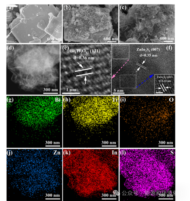 元素 mapping 图(图 2g-l)显示,Bi、Ti、O(来自 BTO)与 Zn、In、S(来自 ZIS)在复合材料中均匀分布,无明显聚集现象,进一步证实 ZIS/BTO 异质结的均匀形成,为载流子转移和反应位点暴露提供了结构基础。