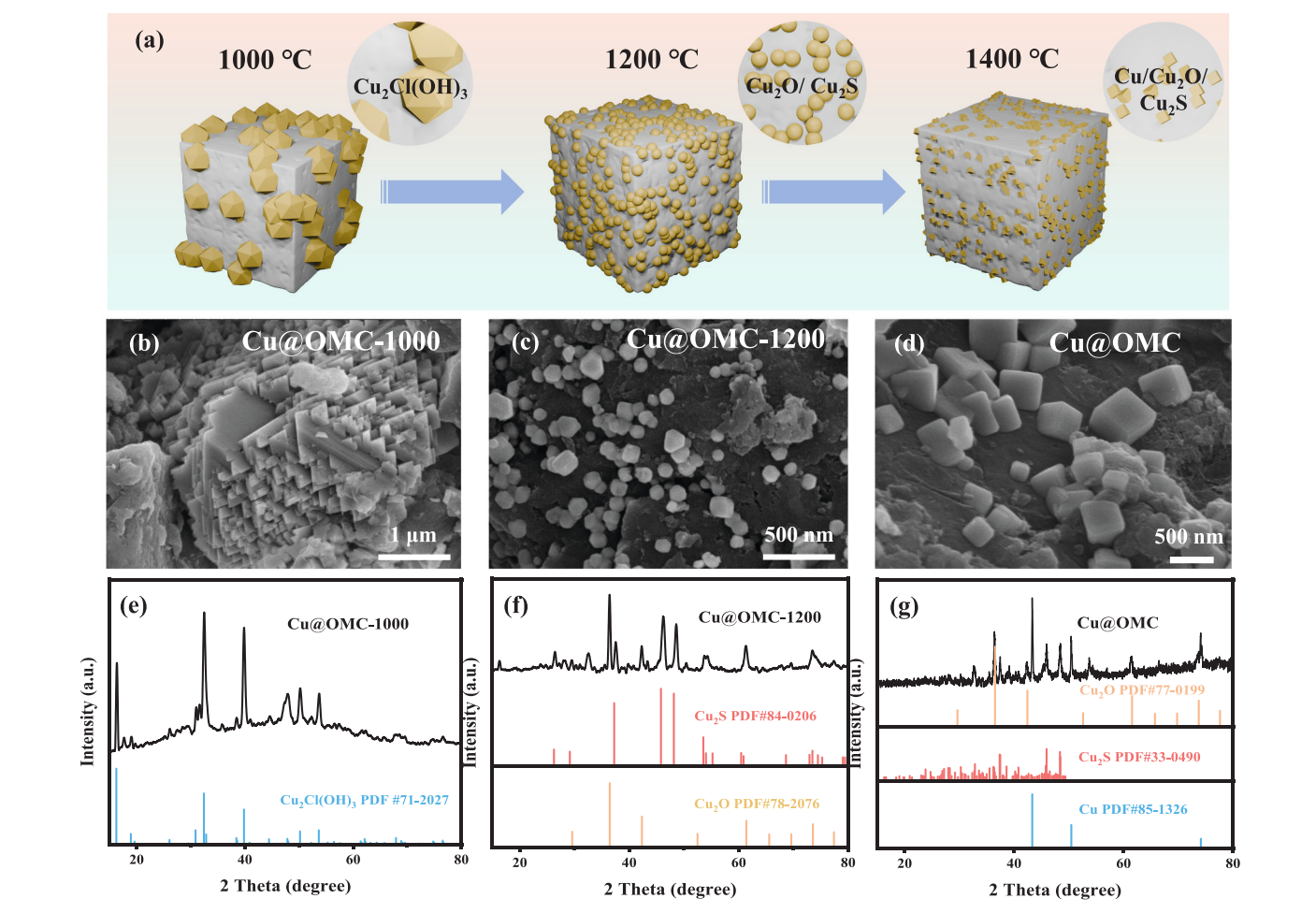 图3展示了在快速焦耳加热过程中,铜基化合物与煤基碳之间的反应及表征。图3a展示了Cu@OMC合成过程的示意图,图中说明了铜基前体与OMC反应并转化为Cu/Cu₂O/Cu₂S异质结构。图3b展示了Cu@OMC-1000在1000°C下的XRD图谱,显示了铜基前体Cu₂(OH)₃Cl在此温度下的结构变化,并且表明其开始分解形成铜的氧化物和硫化物。图3c展示了Cu@OMC-1200在1200°C下的XRD图谱,表明随着温度的升高,铜的氧化物Cu₂O和硫化物Cu₂S开始形成,并且材料的晶体结构变得更加复杂。图3d展示了Cu@OMC-1400在1400°C下的XRD图谱,这时铜基化合物完全转化为Cu/Cu₂O/Cu₂S异质结构,表明高温处理有效促进了铜的还原及与碳基底的相互作用。图3e展示了Cu@OMC-1000的SEM图像,显示了高温下材料的表面形貌,表明Cu₂(OH)₃Cl在1000°C下发生了聚集并与碳基底相互作用。图3f展示了Cu@OMC-1200的SEM图像,显示了在1200°C下,材料表面已经开始形成Cu₂O和Cu₂S颗粒,且颗粒分布均匀。图3g展示了Cu@OMC-1400的SEM图像,此时铜基化合物完全转化为Cu/Cu₂O/Cu₂S,并且这些化合物均匀地负载在OMC表面,形成了稳定的异质结构。