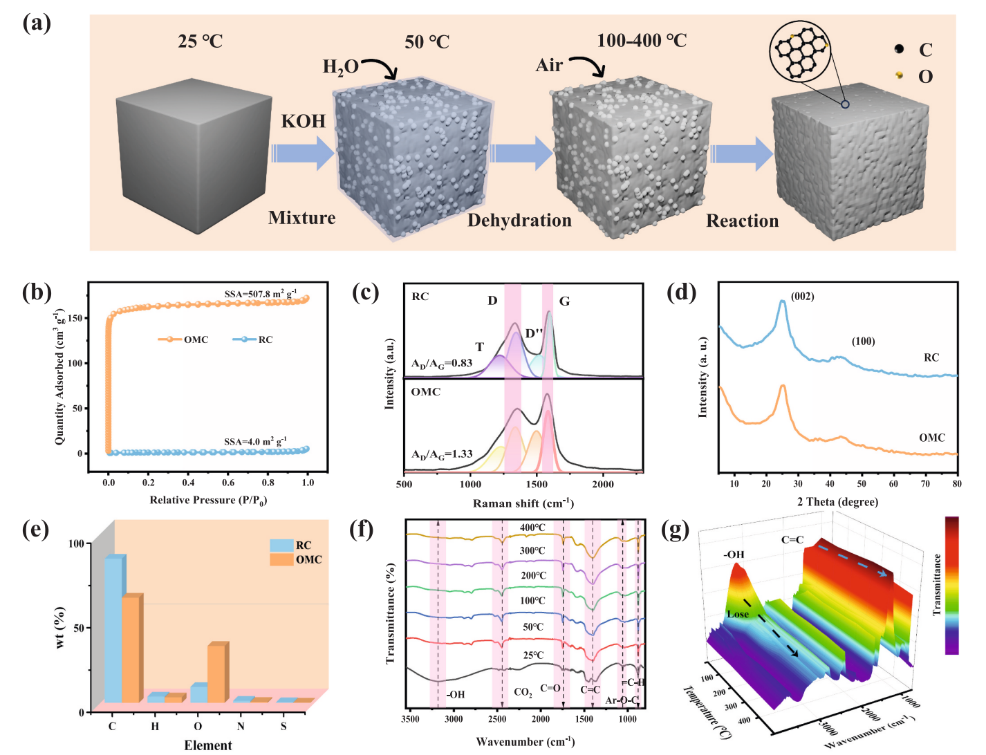 图2展示了低温预氧化过程和表征结果。图2a展示了从原煤(RC)到氧化煤基碳(OMC)的低温预氧化过程示意图。在这一过程中,原煤与KOH反应,脱水并与碱性物质反应,形成了丰富的氧功能基团(如C–O、=C–H),为后续的铜基化合物的负载提供了活性位点。图2b展示了RC和OMC的N₂吸附-脱附等温线,表明RC具有较低的比表面积(4.0 m²/g),而OMC的比表面积显著增加,达到了507.8 m²/g,说明了预氧化过程成功增加了材料的表面孔隙结构。图2c展示了拉曼光谱,揭示了OMC中含有丰富的缺陷位点,这有助于提高材料的电化学性能。D峰和G峰的比值变化(AD/AG)表明OMC具有更高的缺陷密度。图2d展示了XRD图谱,显示RC和OMC均为非晶碳,相比于RC,OMC的晶体结构变得更加无序,这为后续与铜基化合物的结合提供了更好的条件。图2e展示了元素分析,表明通过低温氧化处理,OMC的氧含量从9.41%增加至33.67%,进一步证明了氧化过程的有效性。图2f-g展示了红外光谱(IR)分析,揭示了低温氧化过程中的不同官能团的变化。随着温度的升高,C–O和=C–H官能团的强度增加,表明了氧化过程的有效进行。