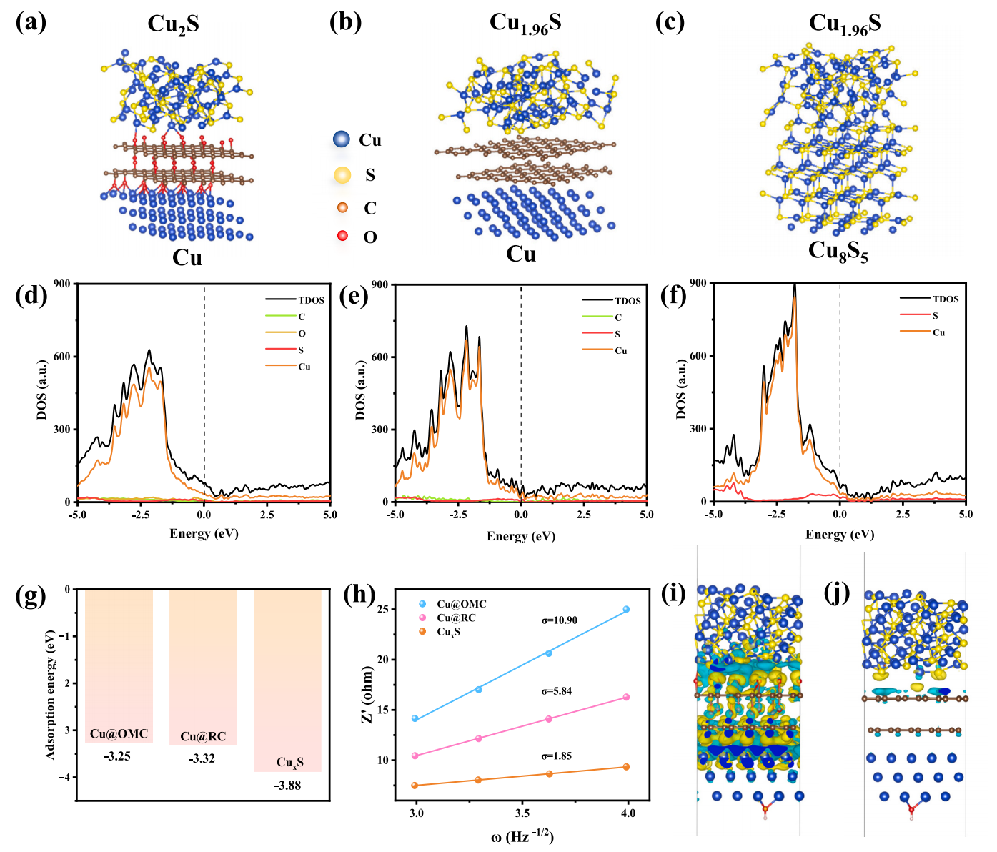 图8a展示了Cu@OMC的原子结构模型,强调了富含氧的碳基底如何与铜基化合物(Cu、Cu₂O、Cu₂S)相互作用,增强了电化学性能。图8b展示了Cu@RC的原子结构模型,与Cu@OMC相比,Cu@RC的结构不如Cu@OMC复杂,电导性和电化学性能较差。图8c展示了Cu@OMC、Cu@RC和CuxS的电荷密度差异,表明Cu@OMC具有较大的电子转移区域,有助于提高其电化学性能。图8d展示了Cu@OMC的态密度(DOS)计算,表明其在费米能级附近具有最高的电子密度,增强了其导电性和电化学活性。图8e展示了Cu@RC的态密度(DOS)计算,显示其电子密度相对较低,电化学性能不如Cu@OMC。图8f展示了CuxS的态密度(DOS)计算,表明CuxS的电子密度较低,且在电化学反应中表现不佳。图8g展示了Cu@OMC的吸附能,表明其能够更快速地进行离子吸附和脱附,提高了功率密度和充放电效率。图8h展示了Cu@OMC、Cu@RC和CuxS的Warburg常数,表明Cu@OMC具有更小的迁移能量屏障,更好的离子扩散能力。图8i展示了Cu@OMC的电荷转移区域,证明氧化碳基底促进了电子迁移,有助于提高电化学性能。图8j展示了Cu@RC的电荷转移区域,相比Cu@OMC,其电荷转移区域较小,表明Cu@RC的电化学性能较差。