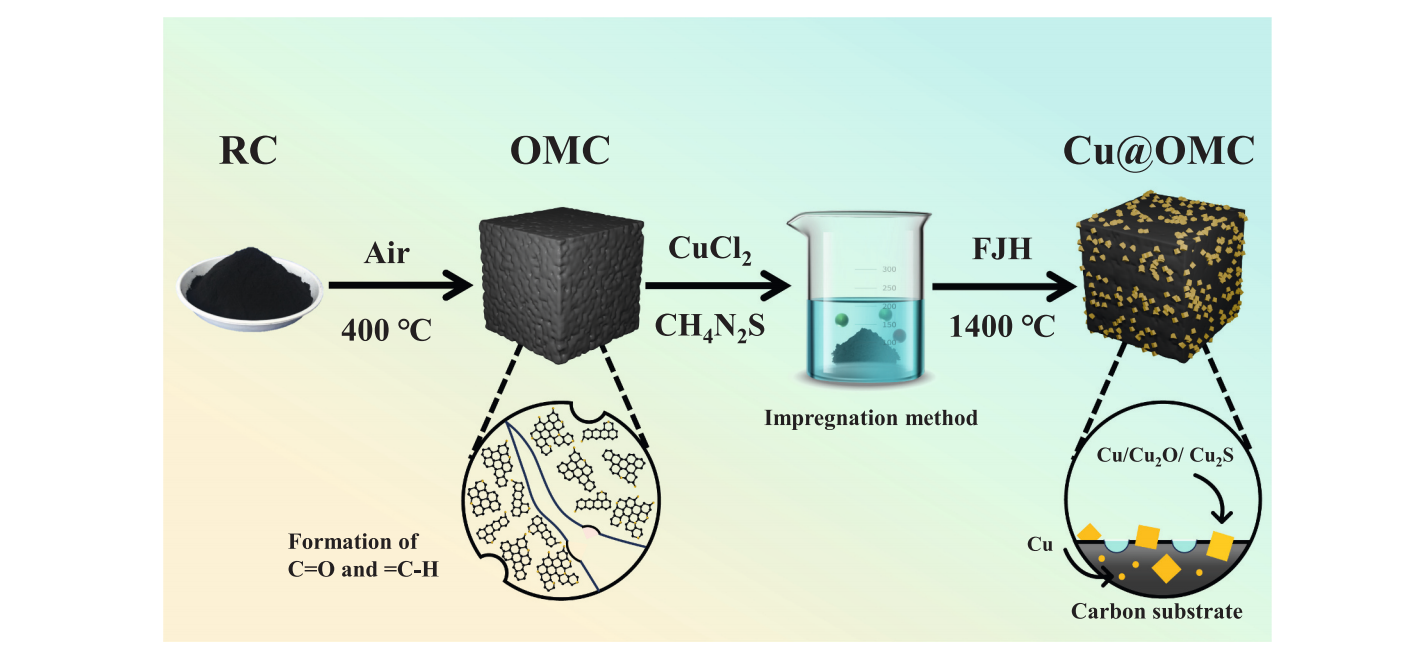 图1展示了Cu@OMC的合成过程。首先,煤基碳(RC)经过低温预氧化处理与KOH反应,形成含有丰富氧功能基团(如C–O、=C–H)的氧化煤基碳(OMC)。这些功能基团为铜基化合物提供了均匀的锚定位点。然后,通过快速焦耳加热过程,在1400°C的高温下,铜基前体(如CuCl₂)与OMC反应,最终形成了Cu/Cu₂O/Cu₂S异质结构,并将其紧密结合到煤基碳表面。这一过程优化了材料的电化学性能,提高了电荷转移效率和伪电容。