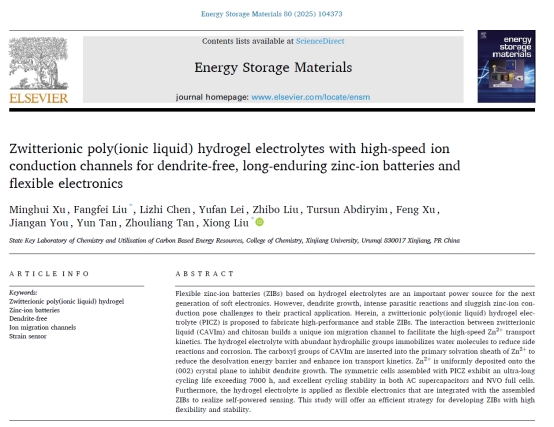 其成果以题为“Zwitterionic Poly(ionic liquid) Hydrogel Electrolytes with High-Speed Ion Conduction Channels for Dendrite-Free, Long-Enduring Zinc-Ion Batteries and Flexible Electronics”在国际知名期刊Energy Storage Materials上发表。本文第一作者为研究生徐明会,通讯作者为刘雄副教授和刘芳菲副教授,通讯单位为新疆大学。