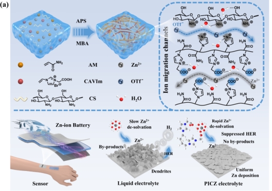 电子领域的快速发展推动了对柔性电子设备的研究需求。其中,设计灵活耐用的可穿戴电池至关重要。锌离子电池(ZIBs)因其安全性、高比容量、成本低、环境友好性而备受关注。但是, ZIBs中锌阳极在电解质中不稳定,易发生副反应并形成Zn枝晶,增加短路风险,降低库仑效率,影响使用寿命。同时[Zn(H2O)6]2+的溶剂化结构,阻碍电荷转移动力学,导致反应速率慢。这些挑战促进了新型电解质体系的发展。水凝胶电解质在ZIBs中非常有前途,它能防止泄漏,抑制活性水分子诱导的枝晶生长并腐蚀,显著提升电池寿命。因此,设计高机械稳定性和离子电导率的水凝胶电解质,对促进Zn2+迁移动力学、溶剂化结构和沉积形态具有重要意义。