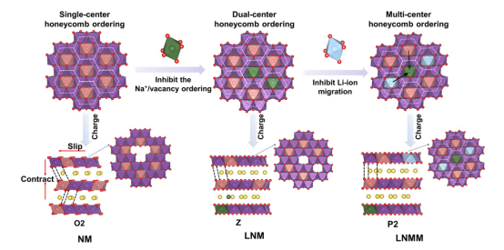 本文在材料设计上充分体现了“原子尺度结构工程”的前沿理念,通过精准调控过渡金属层中阳离子的局域排列方式,构建了多中心协同的蜂窝有序结构。这种从原子尺度出发的结构设计策略,不仅有效抑制了相变与离子迁移等不利过程,还实现了结构稳定性与氧化还原可逆性的同步提升。