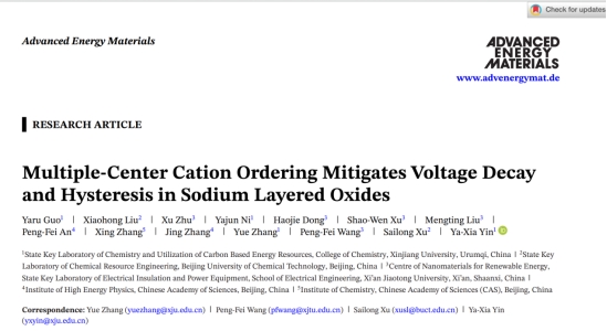 该成果以"Multiple‐Center Cation Ordering Mitigates Voltage Decay and Hysteresis in Sodium Layered Oxides"为题发表在国际知名期刊《Advanced Energy Materials》上。新疆大学为第一完成单位。郭雅茹(新疆大学),朱旭(西安交通大学),刘晓虹(北京化工大学)为本文共同第一作者。